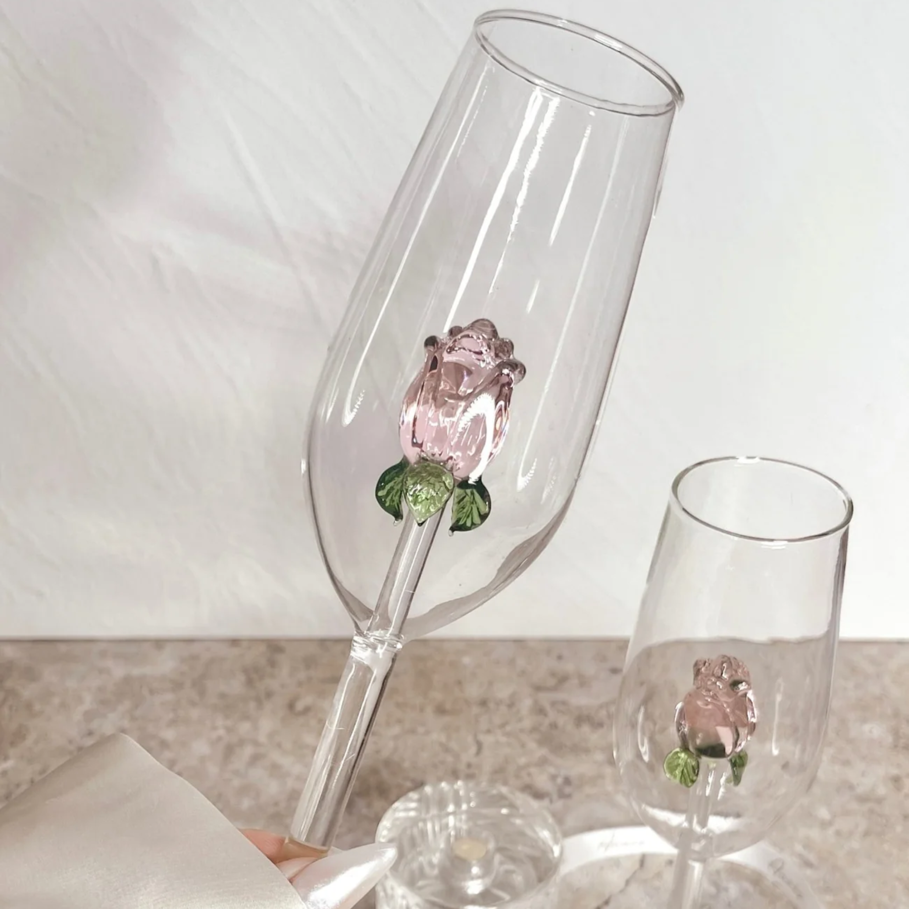Wir empfehlen grundsätzlich eine schonende Handwäsche, damit der edle Glanz und die besonderen Details – ob Strass, Gold oder feine Gravuren – dauerhaft erhalten bleiben. Für gelegentliche Reinigung im Schonprogramm der Spülmaschine sind die Gläser jedoch ebenfalls geeignet.